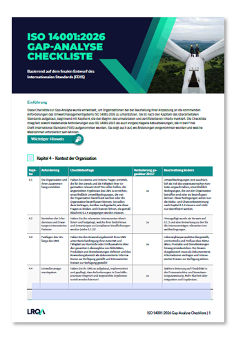 Entwickelt als praxisnahes Selbstbewertungs-Tool unterstützt diese Checkliste Organisationen dabei, Lücken zwischen ihrem bestehenden Umweltmanagementsystem (UMS) und den neuen Anforderungen der ISO 14001:2026 zu identifizieren.