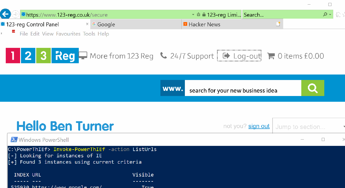 Enumerating the Item property upon this object lists all the current running instances of Explorer and Internet Explorer (I must admit I thought this was curious behaviour). ShellWindows is identified by the CLSID “{9BA05972-F6A8-11CF-A442-00A0C90A8F39}”; the following PowerShell demonstrates activating it.