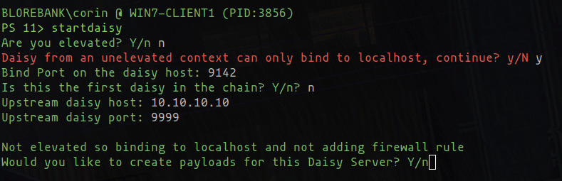 To help with this, we’ve added a wizard. Simply run startdaisy from the implant you want to use as the daisy server and it will guide the operator through the different options and situations before starting the daisy server on the current implant, and generate new daisy payloads that can be used to connect to this instance.
