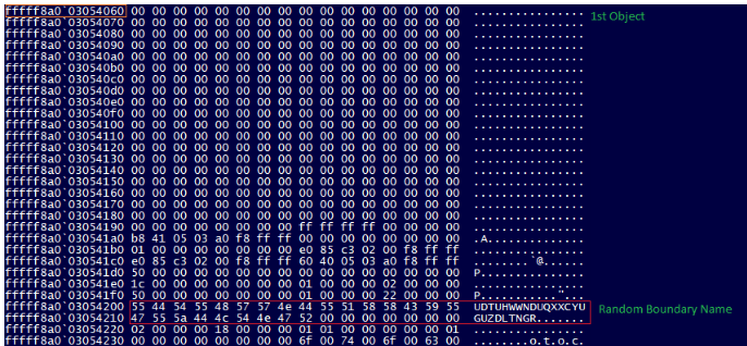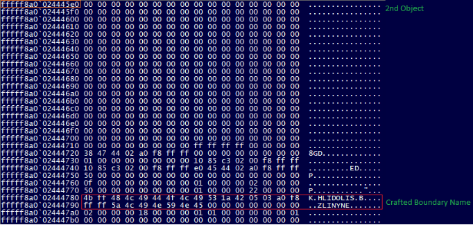 The first and second bytes must be 0x4B and 0xFF respectively (see Figures 1 and 3) to satisfy the byte value checks. Also, in the offset 0x0A (Figure 4 – first pointer dereference) of the crafted boundary name, we will be inserting the address of the first object + the distance in bytes (0x1a0) between that address and the location of the boundary name in that object + an arbitrary offset (0x1A) that contains a value that can be translated to a userland pointer, which satisfies the proof of concept for this version of Windows. Note that we take into account that at the result of the previous calculation, the value 0x0C will be added in order to reach the userland pointer value (Figure 4 – second pointer dereference).