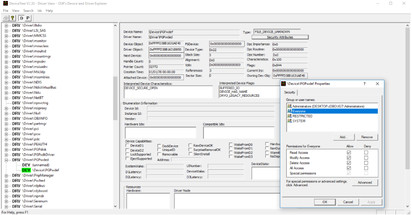 While we were going through the exposed named device objects by the kernel drivers installed, we noticed something interesting. To start with, by using DeviceTree by OSR [2], we could see that PGPwded.sys exposed a device object named PGPwdef.