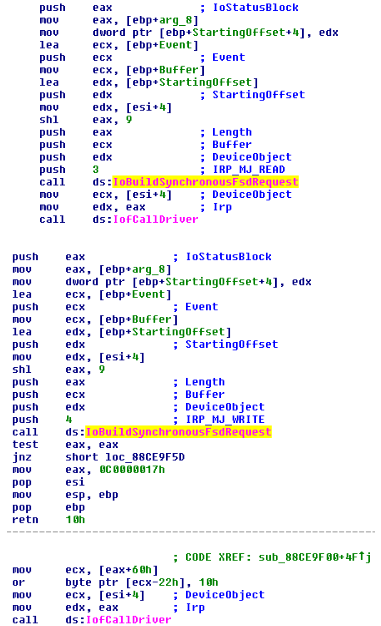 Combined, these two IOCTLs permit the attacker to parse and modify data at will. The impact ranges from abusing the MBR [6] to install a bootkit, to destroying and/or altering data, and finally – as we are about to demonstrate – to elevating privileges on runtime and executing code as the SYSTEM user account.