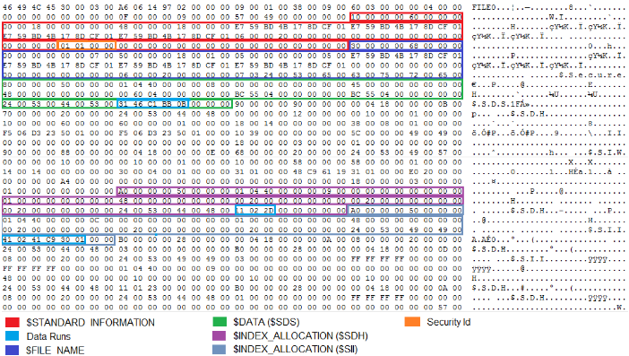 Another example of an attribute that we are about to meet is the $INDEX_ALLOCATION (0xA0) [13] which provides information about the storage location of an index table, such as the $SII and $SDH tables that we mentioned earlier.