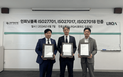 6월 7일 인피닛블록의 정보보호 경영시스템 (ISO 27701, ISO 27017, ISO 27018) 인증 취득을 축하하는 인증수여식이 진행되었습니다.