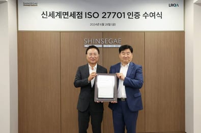 6월28일 신세계면세점의 개인정보보호 경영시스템 ISO27701 인증 취득을 축하하는 인증수여식이 신세계면세점 본사에서 진행되었습니다.