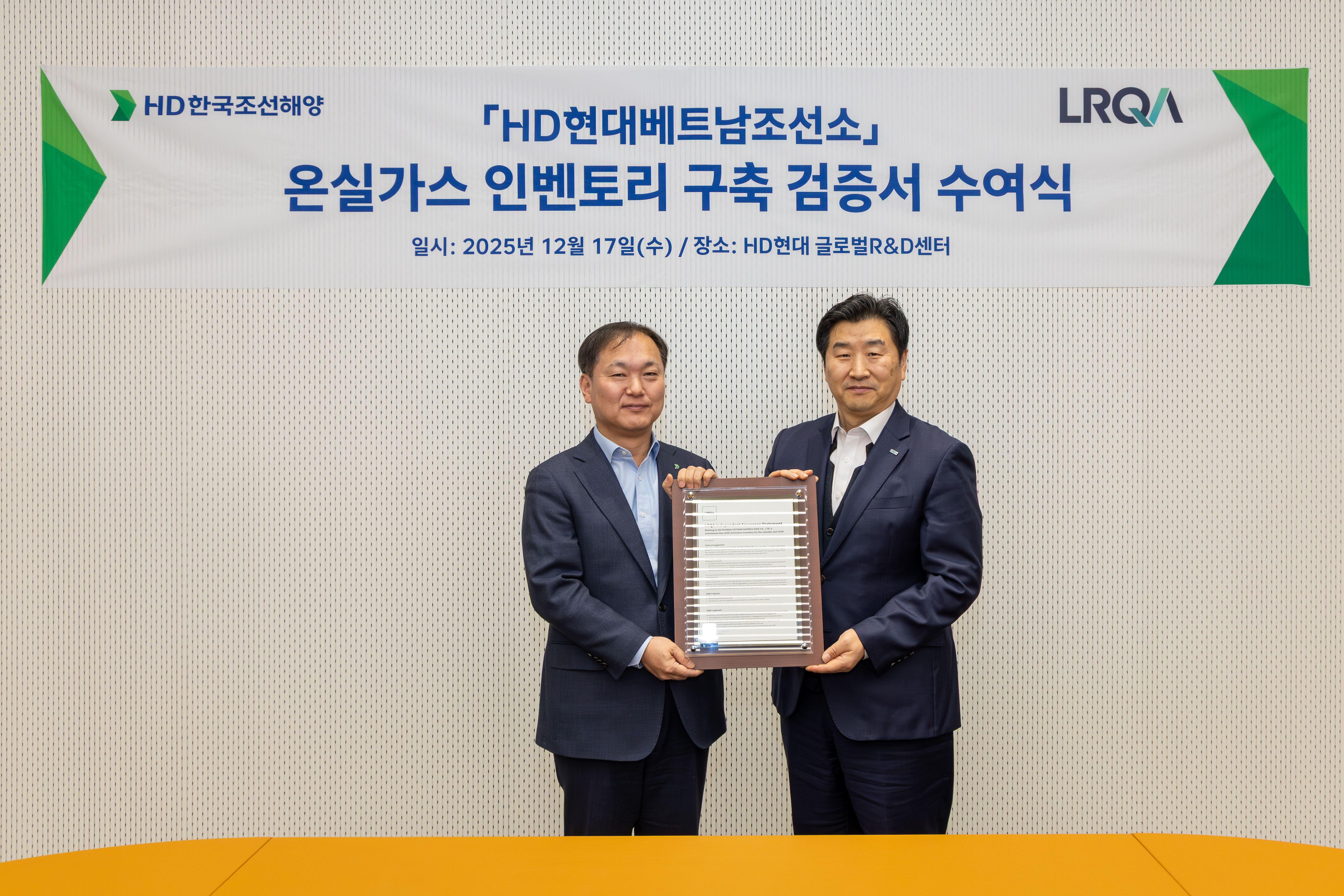 [사진 제공: HD 한국조선해양 l 김형관 HD한국조선해양 대표이사(왼쪽), 이일형 LRQA Korea지사장 (오른쪽)]