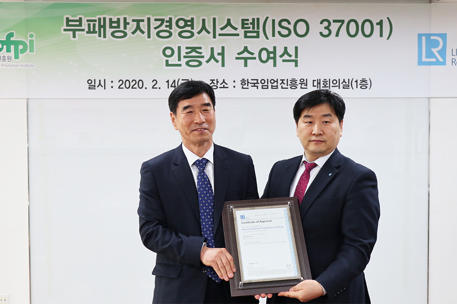 산림의 미래가치를 창조하는 임업서비스 전문기관인 한국임업진흥원​이 로이드인증원(LRQA)로부터 ISO 37001 부패방지경영시스템 인증을 받았습니다.